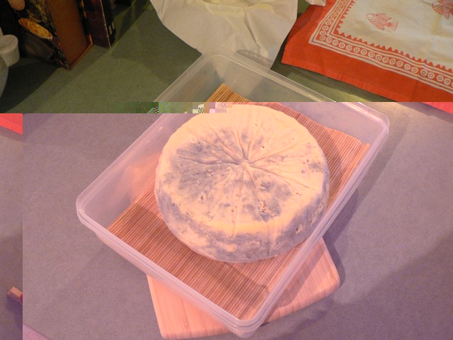 http://www.coquinaria.it/ubb/ultimatebb ... /1532.html" target="_blank" target="_blank ma avrei bisogno di un parere, se vi va. Allego la foto della forma come era ieri (fatta il 2 agosto) e vi chiedo se le fluorescenze (la parte vellutata) che si vedono in supeficie dovrei rimuoverle o meno. Il dubbio nasce dal fatto che, per mancanza di coordinazione dei tempi, quando ho prelevato le muffe da un gorgonzola del negozio, poi le ho lasciate a maturare ben più d 1 giorno e mezzo come consigliato, ma quasi una settimana, e temo una contaminazione. C'è da dire, però, che il tutto era "sigillato" da pellicola alimentare in un bicchiere di vetro.