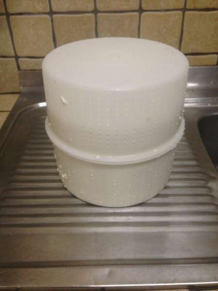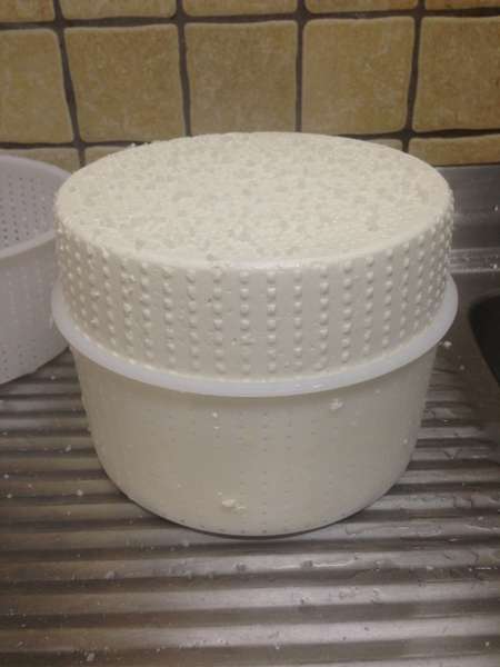 Per maltrattare il meno possibile la cagliata con aggiunte e rabocchi, ho riempito due fuscelle gemelle da 2.5 kg non appena si sono ritirate un pò le ho accoppiate l'una sull'altra grattando con una forchetta le due superfici che dovevano unirsi.