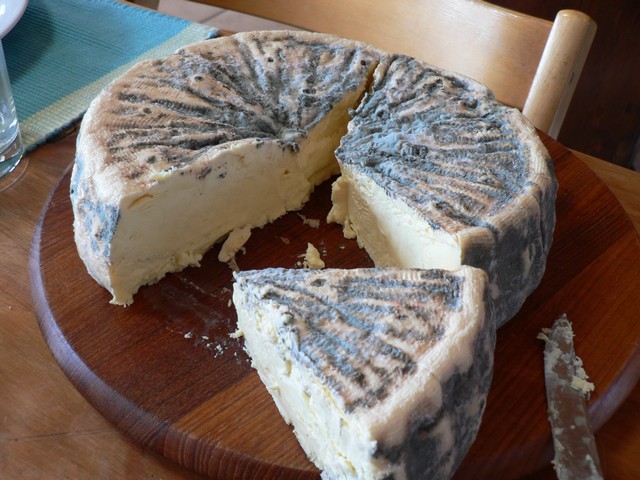 Ciao Tsuna, ciao a tutti. Per chi non mi conosce, sono al mio secondo esperimento in totale, percui siate clementi  per "l'imbranatezza" eh,eh allora, tanto per tenervi al corrente ... Il mio gorgonzola procede.. Per ovviare il problema crosta molle e viscida ho preso un coltello ed ho raschiato via la parte viscidosa in superficie ed asciugato con panno. ora la crosta non e' piu' viscida ma asciutta al tatto. Le muffe pero' mi sembra procedano mooolto lentamente (lavorazione iniziata il 19 aug) Forse il frigo o come tengo il formaggio ? Il triangolino che vedete era l'assaggio quando avevo paura stesse andando a male (quando era viscido al tatto). ora non so che gusto abia perche' non ho piu' assaggiato, pero' da come vedete non e' molle e cremoso all'interno. Tanto per capirci qualcosina di piu'.. che cosa da il formaggio cremoso o meno cremoso? Mi sembrava di capire che il taglio incida molto, ma io l'ho tagliato a cubi molto larghi Ci ho messo anche la panna durante la preparazione.. Ho messo il caglio quando il latte era a 36 C Uffa..  mi piacerebbe tanto riuscire a farne uno bello cremoso... forse la temp del frigo ? La composizione del latte ? Chi mi sa indirizzare ? Per quanto riguarda la resa mi sembra di capire essere buona: da 4 ltrs di latte ora il peso e' 770 gr con la fetta mancante ed il raschiamento della parte viscida della crosta. Mi sapete dire se questo vuole dire che il latte di cui mi rifornisco sia di buona qualita" ? Ho sempre paura perche' qui hanno la tendenza ad aggiungere acqua al latte. nel qual caso come si fa a riconoscere se aggiungono acqua ? Ciao, ciao Grazie