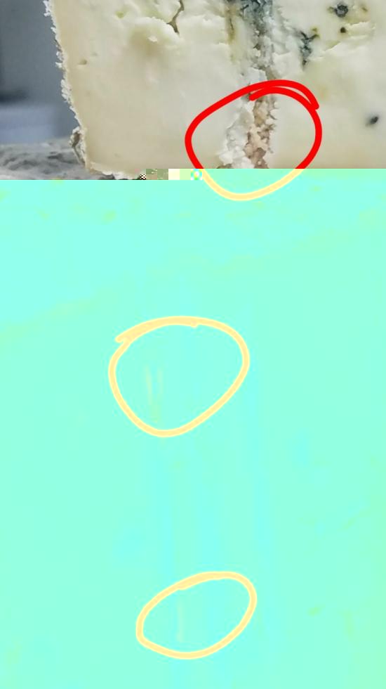 Buonasera a tutti! Ho fatto un erborinato prelevando delle muffe da un gorgo. La forma ha stracchinato molto, quasi appiattendosi, e all'apertura non c'erano striature blu, bensì tracce di muffa color "pane" beige chiaro(forse visibili in foto). Nonostante questo, il formaggio sa comunque da gorgonzola.che muffe possono essere? Nessuno è stato male, quindi sono muffe buone  PS: la forma ha 1 mese.
