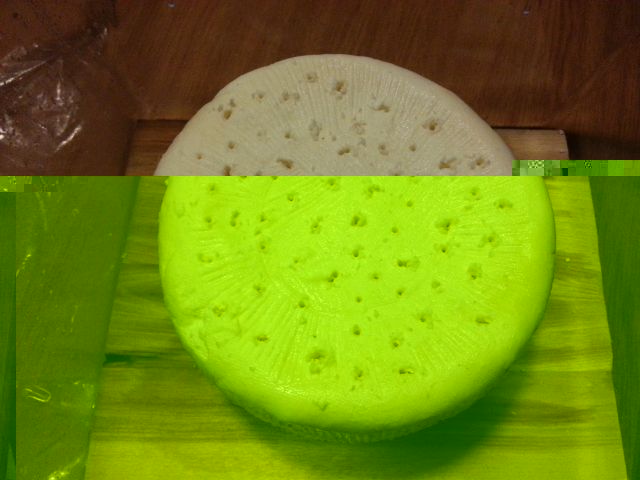 Ti assicuro che è sodo. Questa forma è rimasta dall'unione della cagliata che avevo messo inizialmente in 2 fascelle. Anche i buchi su entrambe i piatti sono ben aperti. L'unica cosa non so se la muffetta va bene o se lo devo ripulire esternamente....