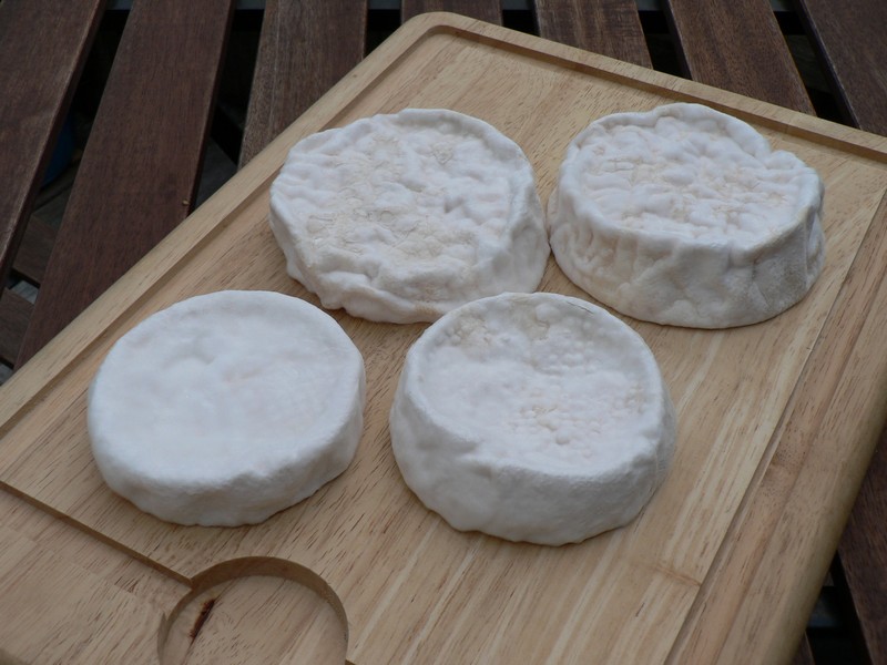 Ciao. Faccio una domanda sul mio stesso Camembert. Vediamo se Tsuna, Twist o forse Meladoro che è esperta di fermenti mesofili mi può dare una risposta. Gli ultimi camembert che ho fatto (foto sotto) sono venuti abbastanza bene ma hanno una leggerissima punta di amarognolo che penso sia dovuta al cattivo spurgo della cagliata. Questo perchè in verità sono riuscito a fare un solo rivoltamento perchè la cagliata era molto molle e spappolosa e nel rivoltamento mi si sarebbero rotte completamente le forme. In parte la poca consistenza della cagliata può essere data dalla stagione (qui siamo a fine estate) ma anche dall'uso dei mesofili che, per quanto ne so, inibiscono la coagulazione. qual'è la soluzione migliore secondo voi? Aumentare la quantità di caglio? Il tempo di coagulazione? La temperatura di coagulazione? Ho anche appena comprato un nuovo caglio con doppia forza (240 IMCU che penso corrisponda a circa 1:20.000) e la prossima volta lo provro. Inoltre mi devo far spedire delle fascelle apposite per camembert (senza fondo in modo che il rivoltamento non richieda l'estrazione della forma). Nel frattempo cosa suggerite?