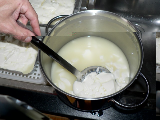 -2a rottura: tagliare dolcemente la cagliata a grandezza di noce, magari anche in pezzi piu' grossi. Fare semplicemente qualche movimento con la schiumarola giusto per rompere la cagliata in profondita'