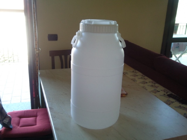 il pentolone è da 50 ma poi è ovvio che se ne lavora meno di latte... Per il trasporto uso bidoni in PVC da 25 Litri.