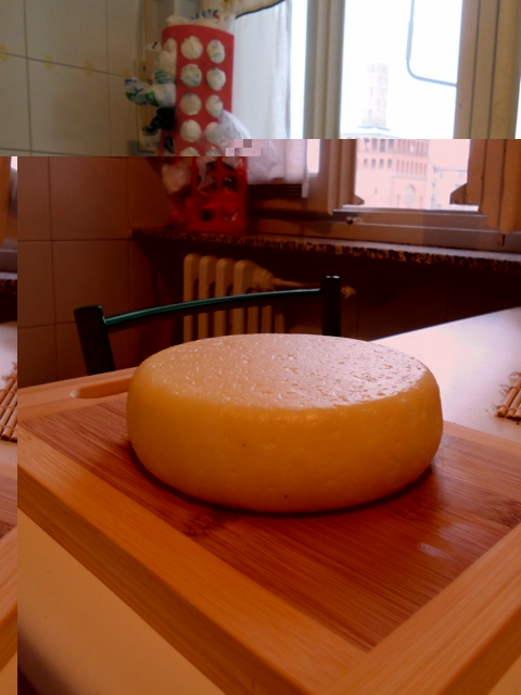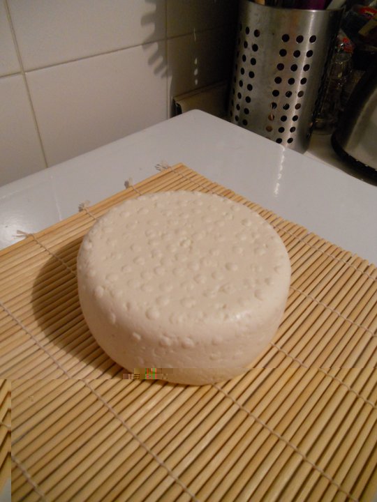 4 litri di latte vaccino pastorizzato non omogeneizzato, portati a 40°C, messo mezzo vasetto di yogurt e lasciato riposare 40 minuti, incopertato. Portato a 36°C e aggiunti 1,5 ml di caglio liquido, lasciato riposare altri 40 minuti, incopertato. Taglio della cagliata a cubi di circa 3 cm di lato, riposo di 10 minuti. Taglio con frusta a nocciola, o forse un po' più piccolo, riposo di altri 10 minuti. Messo nella fuscella e fatto sgocciolare per 2 ore circa, rigirandolo 5 volte. Stufatura nel forno (spento) con bicchieri pieni di acqua calda per 2 ore circa, rigirandolo 3 volte. Salatura in salamoia (180 g/litro) per 1/2 ora per lato. Messo in frigo.