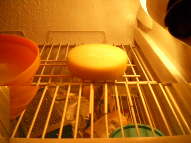 visto che ho la foto allora metto anche io la mia caciottina fatta lunedì e che sta "stagionando" in frigo. Visto che fa caldo meglio tenerla in frigo secondo voi? Nel punto più freddo della casa ci sono 20°..... ciau sabrina Allegato: