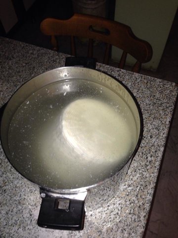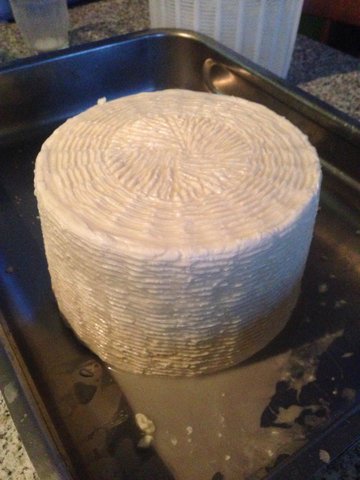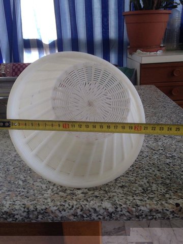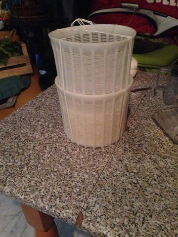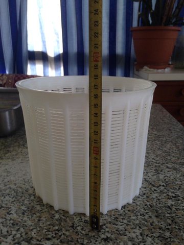 La forma è pronta dopo attimi di terrore: Ho messo 9 ml di caglio per timore che non funzionasse e 45 minuti dopo essere stato portato a 36° il latte era completament liquido. Ho aspettato altri 50 minuti e la cagliata era ottima........misteri della vita. Su 23 litri di latte complessivi la forma pesa Kg 2.850 la resa è bassina 12.4% .....accetto conigli. Appena finisco di scrivere vado a tirar fuori la ricotta ecco le foto di quello che ho combinato. Adesso devo andare sul forum a leggere perchè mica ho capito quando la devo stufare. P.S. Ho visto sul web un coso fatto con delle piastre e delle barre filettate per pressare che è semplicisssimo da fare appena ho un po di tempo lo autocostruisco, onestamente come prima volta in assoluto che mi sono cimentato sono soddisfatto.............UN SALUTO A TUTTI.
