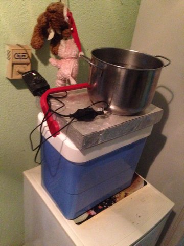 Per la stufatura utilizzo un frigo portatile alla cui base ho messo tre dita di acqua calda tenuta in temperatura da un cavetto scaldante per acquari. Questo è fornito di termostato che mi tiene la temperatura ambiente costante a 25°
