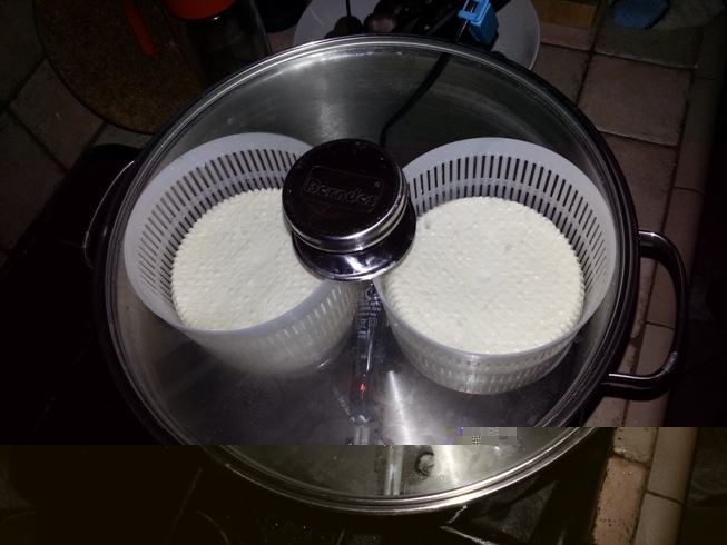 aggiunto 4ml di coagulante liquido e ho atteso circa 70 minuti per la coagulazione dopodiché ho effettuato dei tagli a quadrotti di circa 3cm, ho aspettato circa 15min. e successivamente ho frantumato la cagliata e ridotta alla grandezza di un chicco di riso. Ho aspettato 10min. ed ho effettuato una nuova cottura sino a circa 48° dopodiché sono passato a riempire le fuscelle 3 da 500gr.
