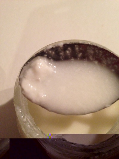 L'avevo appena tirato fuori dalla yogurtiera ma ho letto che dovevo mescolarlo con forza. Ho fatto le foto prima perché volevo un parere sulla divisione del siero dal resto e sulla consistenza. Mi aspettavo in realtà qualcosa di grumoso sul fondo del contenitore e non una cosa così liscia. Ecco l'aspetto finale