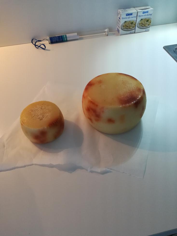 Buondì Tsuna. Effettivamente le forme le ho girate solo una volta in quanto non ritenevo fosse così importante visto il breve periodo in cui le ho lasciate dentro (50 min. la piccola e 1 ora e 40 la grande). Non ci avevo neanche pensato in quanto le macchie sono presenti anche sul bordo, che è sempre stato immerso dato che le metto sempre orizzontalmente. Per quanto riguarda il PH non l'ho mai misurato. Purtroppo questa volta ci sono verificate delle variabili che non mi fanno capire cosa potrebbe essere la causa del difetto (Un caglio usato per la prima volta, un sale mai utilizzato, la temperatura eccessiva, e come non bastasse anche la paprika (che forse me ne è restata un pò sulle mani), oppure la combinazione tra esse. Comunque vediamo se con le foto fmi faccio capire meglio. Facendo un raffronto con quella del 13 si nota che le macchie non si sono allargate ma sono diventate solo più scure (ho cercato di metterle nella stessa posizione). Vorrei chiederti Tsuna, la mia pastorizzazione a 72° mi mette al riparo da ogni eventuale contaminazione del latte o no? Te lo chiedo questo perchè il contadino mi ha detto che forse in quei giorni ha avuto dei problemi  ( non ho approfondito ma posso chiedere) e pertanto se lo posso mangiare. Grazie.