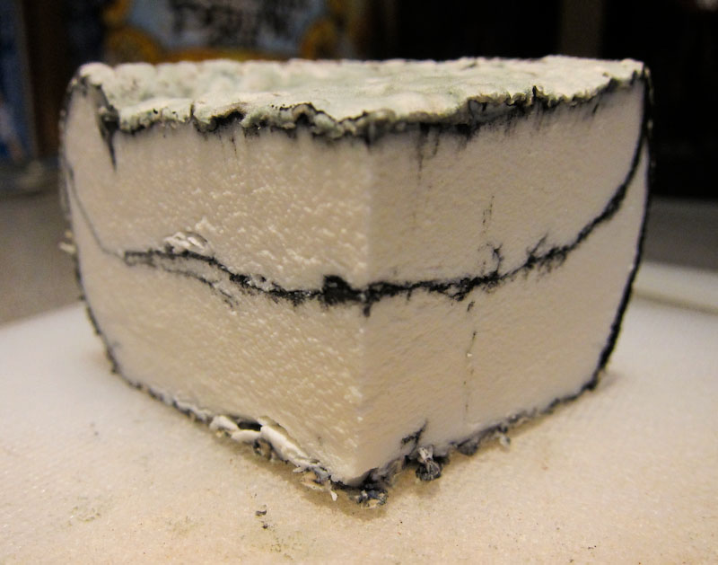 Di giorno 8-12 il formaggio è pronto a tagliare il più fresco, ma può essere tenuto per diverse settimane, come gli enzimi di superficie continuano a lavorare sulle proteine, portando a una maggiore complessità di sapore. In un recente seminario ho deciso di aggiungere le ceneri di mio Camembert tradizionale per vedere come procedeva. Questo non è un formaggio lattico ma un formaggio coagulato caglio e fatto con latte ricco di mucca piuttosto che il latte di capra. Il latte che uso per questo è un latte intero Jersey grasso e ha un alto contenuto di grasso di circa il 5-5,2% che viene completamente incorporata in questo formaggio. Dal momento che il grasso tende a contenere più umidità, ho sempre avuto difficoltà di essiccazione del formaggio in giù a causa della tendenza di grasso di latte per tenere l'umidità. I miei pensieri erano che il carbone sarebbe asciugare la superficie di più e questo è esattamente quello che sto vivendo finora.