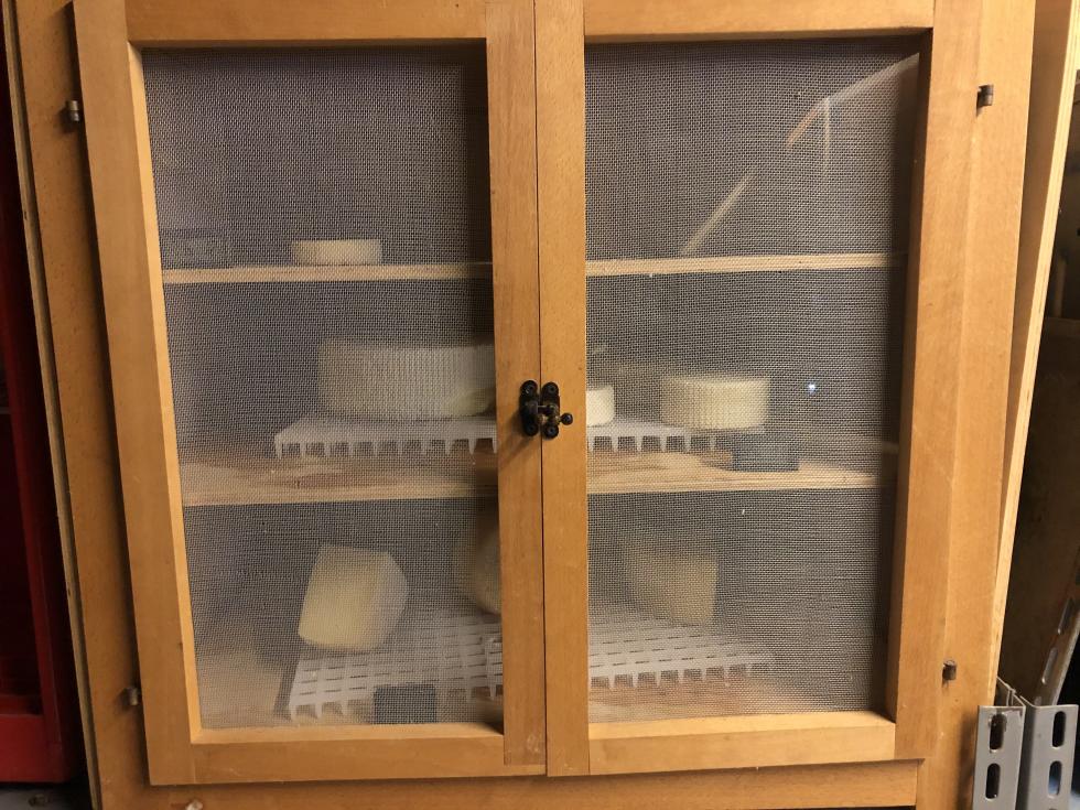 Ciao a tutti e ben ritrovati dopo tanto tempo. Ho ripreso a fare qualche formaggio visto il clima freddo ed umido della mia zona (Forlì-Cesena). Acquisto latte da una stalla delle mie parti, il più delle volte appena munto ed ancora caldo. Le quantità sono esigue, 25 litri alla volta per diverse lavorazioni. Scaldo il latte a 38 gradi e verso 12,5 ml di caglio Rappelli (Attività coagulante SOXHLET: 1:10000) nella massa mescolando brevemente. Dopo 40-45 minuti rompo la cagliata in pezzetti grandi tra una noce ed una nocciola quindi ne metto in fuscelle una parte per il reviggiolo e primo sale. poi scaldo il rimanente fino a 50 gradi con una velocità di 1 grado al minuto mescolando sempre più frequentemente. Raggiunta la temperatura di 50 gradi comincio a mettere in fuscella dentro il siero, perchè altrimenti si raffredda e fatico a compattarlo. Premo con le mani per farlo aderire bene alle sagoma poi lascio dentro e accendo il fuoco. Tolgo le fuscelle dal pentolone raggiunti i 75 gradi circa e lascio il siero finchè la temperatura della massa arrivi agli 85 gradi quindi aggiungo un litro di acqua termale (salsobromoiodica) e lascio raffreddare per poi dopo ore raccolgo la ricotta (buonissima). La salatura ho tìprovato a farla a contatto ed in salamoia seguendo le indicazioni sul forum al 18% e lo tengo per 17 ore. La stagionatura procede bene ma ad un certo puto compare questa muffa dall'odore acre che invade la buccia ed oltre. Nemmeno lavando costantemente i formaggi e i ripiani sono riuscito a contenerla. La stagionatura avviene in un armadietto in faggio autocostruito con zanzariera e tre pareti mobili che uso da regolatori di umidità e ripiani in multistrato di betulla. Questa per quanto possibilie cerco di tenerla attorno al 75%, tre igrotermometri mi restituiscono i valori per piano. La temperatura oscilla tra i 3 ed i 12 gradi a seconda del meteo. Dopo 6 settimane il formaggio ha una buona consistenza, la buccia (se non fosse per la muffetta) sarebbe edibile e di buon gusto, ma se rimane un buchetto questa penetra di qualche millimetro nella pasta interna e tende a rovinarne il sapore.