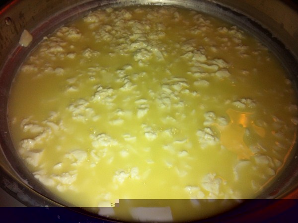 Attesa 30 minuti, controllare con il dito che la cagliata sia ben formata Rottura della cagliata prima a croce e poi senza nessuna sosta viene tagliata alla grandezza di una nocciola. Si aspetta 10 minuti e si mettono nelle fuscelle pressando bene, con un rivoltamento solo dopo circa 30 minuti.