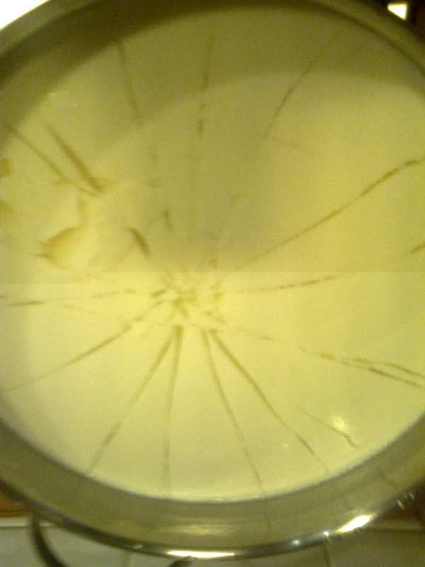 4 litri di latte intero alta qualità (del supermercato, pastorizzato) + 4 cucchiai di siero maturato scongelato (essendo surgelato ha perso il 50% di forza, quindi ho raddoppiato).