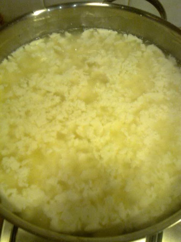 Portato a 38°C ed aggiunti 40gr di sale fino. Mescolato bene, aggiunto caglio in polvere (0.4g/l) sciolto in poca acqua al momento e mescolato di nuovo bene. Chiuso e coperto per 60 min. Poi ho eseguito il primo taglio, ho lasciato riposare 15', quindi ho eseguito il secondo taglio (dimensioni nocciola) usando delicatamente una frusta da dolci ed ho lasciato riposare 15'.