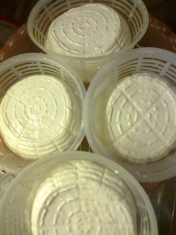 Ho riempito 4 fuscelle (da 8cm di base), le ho rivoltate la prima volta dopo circa 15', poi nelle due ore successive ogni 30'. La tecnica del "rivoltamento" ancora non mi viene benissimo ed ho delle forme un pochino ubriache!!! Dopo le due ore la quantità nelle fuscelle si è quasi dimezzata! Pesate le quattro forme, mediamente risultano da 280gr ciascuna. Considerato che un po' di siero verrà ancora perso, direi che ho ottenuto una resa del 25% circa, corretto?