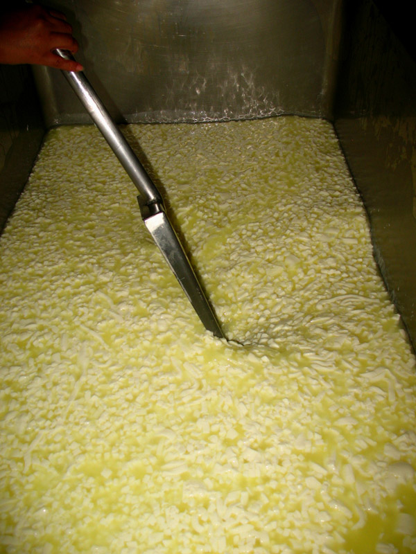 Levare in parte il siero, e mescolare la cagliata per agevolare l’ulteriore spurgo di siero, sino a levarlo tutto.