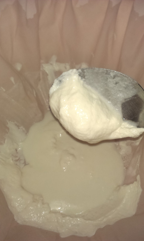 Mi pareva già piuttosto compatto, ma siccome temevo, avendo letto qui di sorprese sul fondo, che fosse una finta, l'ho rovesciato pian piano in un telo a scolare e l'ho messo in frigo. In effetti sotto era un pochino meno denso.