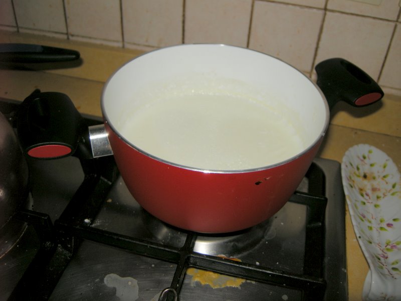 be ho messo a punto una procedura: a mezzogiorno metto a bollire il latte fresco parzialmente scremato in un tegame rivestito di ceramica (comperato apposta) Allegato: