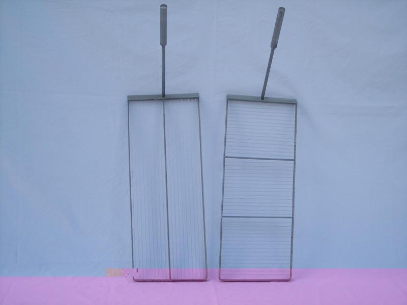 Salve a tutti. Avrei bisogno di un consiglio. Vorrei inziare a fare qualche forma in piu' di quel montasio che mi avete insegnato in questo forum. Avrei trovato un piccolo laboratorio da affittare saltuariamente, con tutta l'attrezzatura. La caldaia e' da 900 litri quadrata. Solo che le lire che usano qui, come quelle nella foto, hanno i fili a una distanza di 9 mm tra loro. A me sembra un poco troppo, anche per ottenere un taglio a chicco di mais. Cosa ne pensate? Confesso di avere un po' di paura di fare la prova con 100 litri di latte per scoprire che il taglio non va bene! Normalmente qui si fanno due passate, con il taglio in verticale e poi quello in orrizzontale. Comunque non ho mai visto come tagliano per fare il cheddar. E ancora: se volessi fare anche un poco di mozzarella- e quindi tagliare a noce-, dovrei fare due set differenti di lire oppure usare lo stesso set in modo diverso nell'effettuare il taglio? Grazie e saluti.