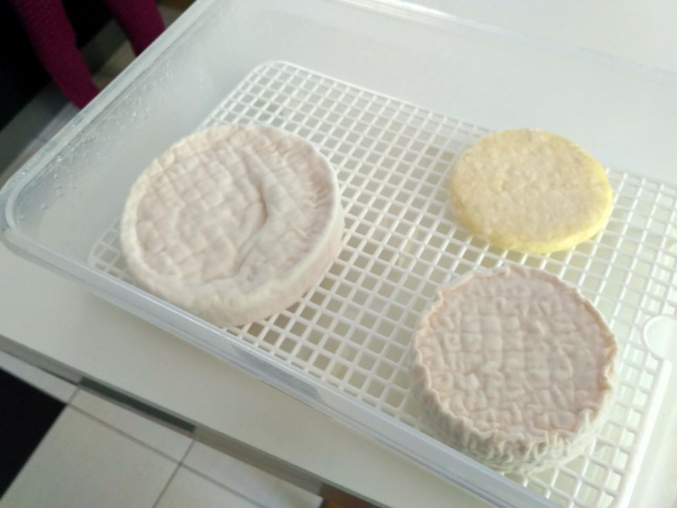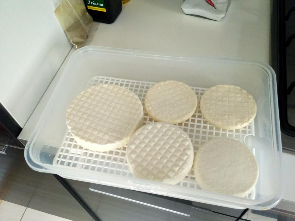 Per la stagionatura purtroppo ho solo il frigo, ripiano piú alto. Li giravo ogni paio di giorni. Ho letto che bisognerebbe spruzzare un po' di candidum sopra, ma non volevo che mi invadesse il frigo quindi non l'ho fatto. La muffa bianca é fiorita molto bene comunque, anzi, un po' attaccava anche le tome :D