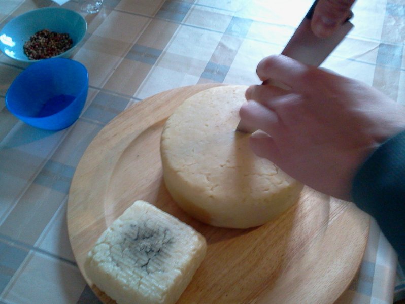 aperte le forme di tsunacotto. mi è piaciuta la consistenza, anche se dovevamo aprirle un po' prima, perchè con la stagionatura in frigorifero a 4 gradi si è asciugato troppo. anche come sapore era leggermente sotto le aspettative, buon sapore con una leggera somiglianza al grana, ma meno saporito del previsto. la forma più piccola l'abbiamo pulita bene (il nero sulla crosta si è fermato li) e la usiamo da grattugiare. Sicuramente è stata un'esperienza da ripetere (e così ho fatto il cristiancotto). posto le foto