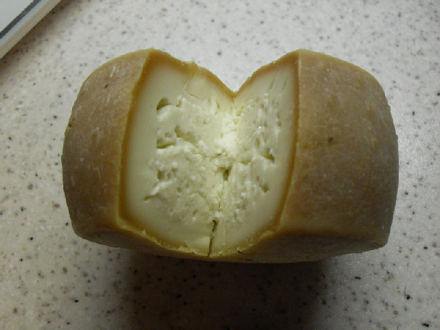 ....qualcosa è andato storto...dopo aver seguito la ricetta del Montasio ho messo a stagionare in frigo la mia formetta. Dopo circa due mesi mi accorgo di un leggero gonfiore sulla parte superiore ed inferiore (un po meno) ........ dopo qualche giorno iniziano ad apparire le prime crepe sempre sulla parte superiore ed inferiore, oltre ad un gonfiore sempre più pronunciato.......prima della prevedibile esplosione ho tagliato una fettina ed ecco il risultato. Duro in periferia, morbido all'interno, occhiatura elevata, sapore simil taleggio....non mi sembra proprio Montasio