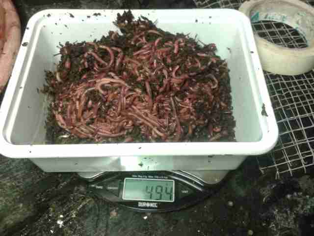 per essere ancora più chiaro, questo è il mio primo "raccolto" che sono riuscito a separare e pesare: un groviglio di vermi di circa 500gr. siccome non ho serre climatizzate e dove sono io fa freddo, avendo piccole quantità di vermi li tengo in lavanderia in dei bidoni da vernice (misurano più o meno 30x30x30). la prima domanda è: mi confermate che i lombrichi mangiano molto più velocemente a 20 gradi piuttosto che a 5 (temperatura media esterna dalle mie parti) oppure lasciarli fuori non cambierebbe significativamente la produzione? perchè mia moglie, per motivi incomprensibili  , non è molto felice di ospitare i vermi in lavanderia. la seconda domanda è: i 500 gr della foto li vedreste meglio in un bidone da vernice pieno di copost maturo o in due o più? infatti mi sembra di avere capito che al di sopra di una certa densità i vermi non lavorano bene. grazie!