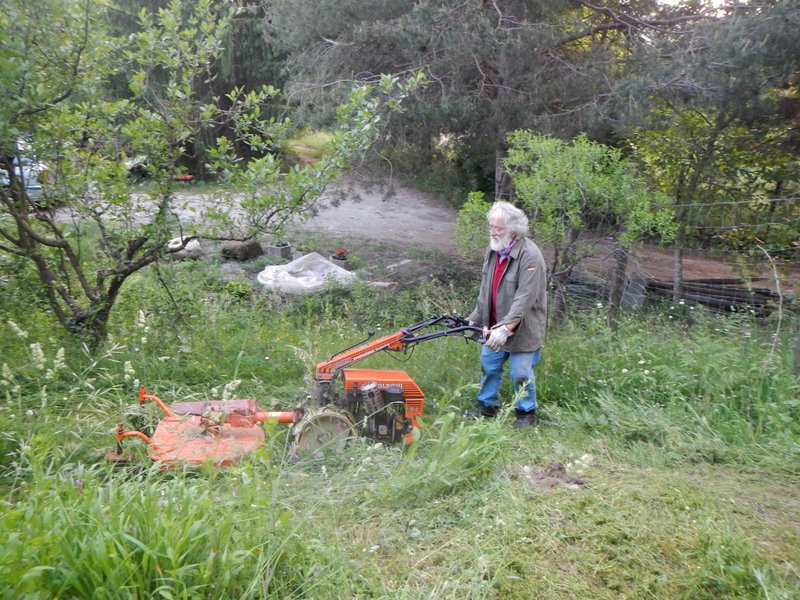 Per il tipo di uso descritto andrebbe bene una piccola trincia a tamburo. Taglia, frantuma e lascia sul terreno tutto quello che gli passa sotto: erba, legnetti, sterpaglie, …