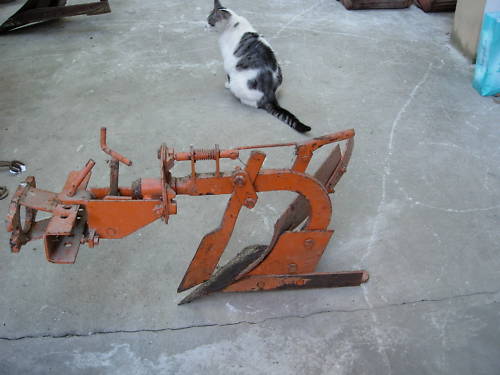 facendo ad occhio il paragone con il gatto penso anche io che sia per motocoltivatore. Il mio aratro,utilizzato su un bcs 705 da 16 cv , ad occhio mi sembra anche piu grande. Poi in effetti l'attacco a due bulloni sembra proprio quello della presa di forza.