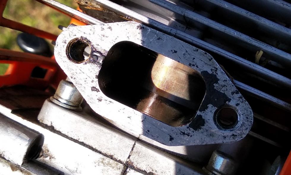 Posto una foto di quello che si vede dall'apertura dello scarico, la canna del cilindro è messa bene, non ho notato rigature, si vedono ancora le lavorazioni di macchina a 45°, mi sfugge il nome tecnico.