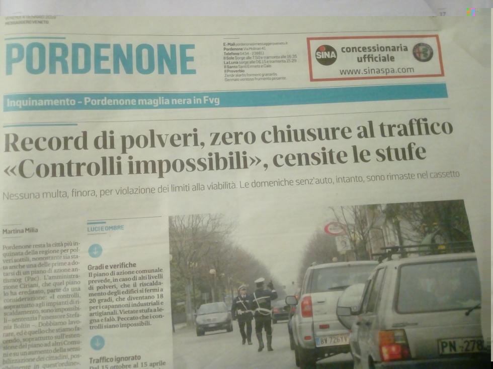 Anche quì come sopra.....s'invoca un pò di pioggia. Molti agricoltori si sono presi avanti coi lavori, tanti hanno arato e molti hanno seminato, non chiedetemi che cosa.. Polveri sottili alte e, purtroppo, non sanno cosa fare e come procedere. Ci si butta sulle caldaie e sulle stufe ma.....non so!! Poi dicono che anche lì i controlli sono difficili....ed io ....P.V.(esclamazione scurrile)..ed io a consegnare al Comune ogni due anni la dichiarazone di avvenuto controllo della cadaia a metano che ho singola. Dicono che altrimenti rischi un controllo.....ma dove e come. Quelli che capiscono tutto sono i comici e....... i ladri....osservare le loro indicazioni/movimenti. Vanno con le ruspe e i camion incendiati in auostrada a scassare il furgone portavalori e poi con altri blocchi per rubare tonnellate di tabacchi.