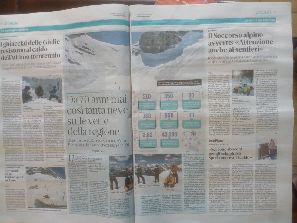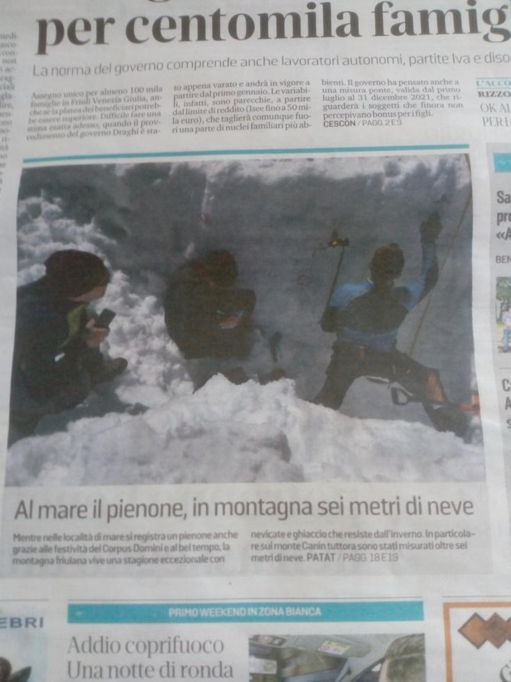 Motho anch'io non voglio infierire ma appare la notizia che sul monte Canin (UD) ci sono 6 metri di neve e oggi tempo permettendo avrebbero riaperto l'impianto sciistico inerente. Dicono che un evento simile comparve nel 1950. Allerta per i sentieri pieni di neve e ghiaccio. Mi viene voglia di andare a fare un tuffo nella neve......aspetto che migliori il tempo.... Buona sera a tutti