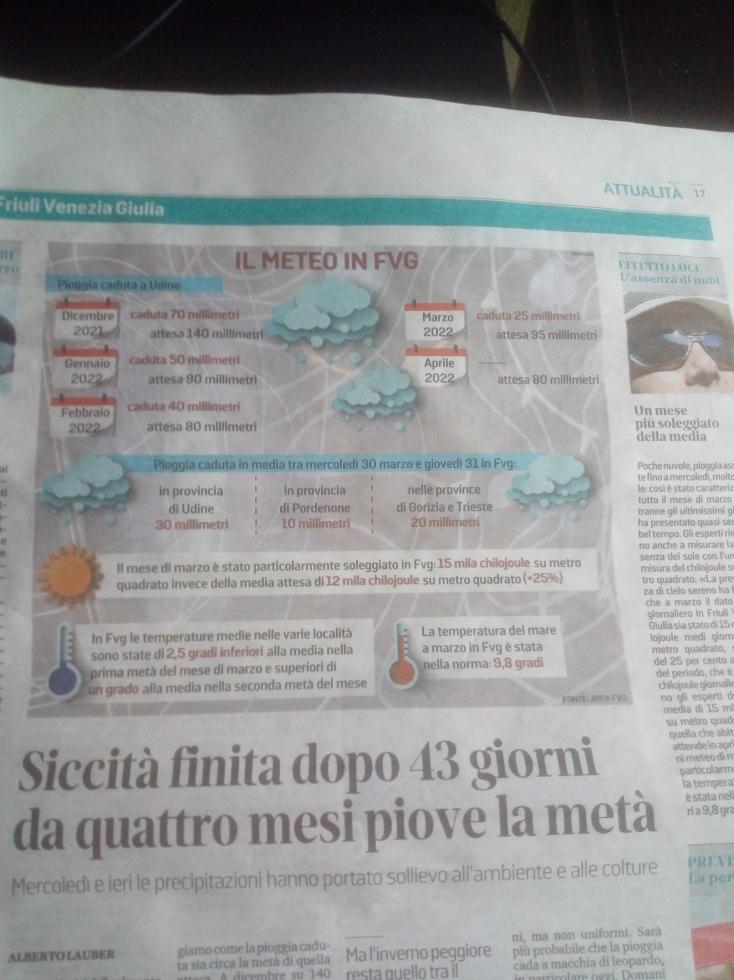 quì pioggerellina di poca entità questa mattina adesso schiarita. Però avevano previsto piogge e temporali nel pomeriggio. A sentire motho se poco fà sono cominciati in Lombardia, i temporali, gli diamo tempo per l'arrivo in Friuli. Le notizie sulla stampa di questa mattina dicono la piovosità media di due giorni tra il 30 e il 31 marzo. In provincia di Udine 30 mm, in provincia di Pordenone (dove mi trovo io) 10 mm, nelle province di Gorizia e Trieste 20 mm