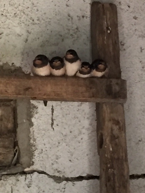 Da me le rondini ci sono, c'è un nido coi piccoli nel pollaio e la prima nidiata con 5 rondinelle si sono involate a fine maggio. Un altro nido nel capanno s'è purtroppo staccato, forse per il troppo caldo, e i pulli son caduti a terra! Ecco i piccoli di rondine appollaiati su una scala, pittosto incerti prima di uscire nell'unico giorno un po' fresco di fine maggio. Spero che la foto si veda e non sia rovesciata.