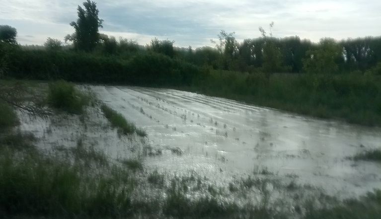 ai margini dell'area alluvionata, e dobbiamo ringraziare per i lavori negli ultimi anni su fognature e sbocchi a mare, nessuna casa sott'acqua, perlopiù frane in movimento in collina e strade interrotte, il torrente vicino al mio terreno è esondato, 500 metri quadri di orto, lavorato, concimato e fresato, con tanto di porche per fagioli dell'occhio e fagiolini, 80 piante di pomodori, poi zucche, zucchine e mais dolce, cetrioli e melanzane, tutto sotto un metro e venti di acqua e fango, due giorni fa il torrente è rientrato negli argini e l'acqua ha cominciato a defluire ieri sera si presentava così come nella foto
