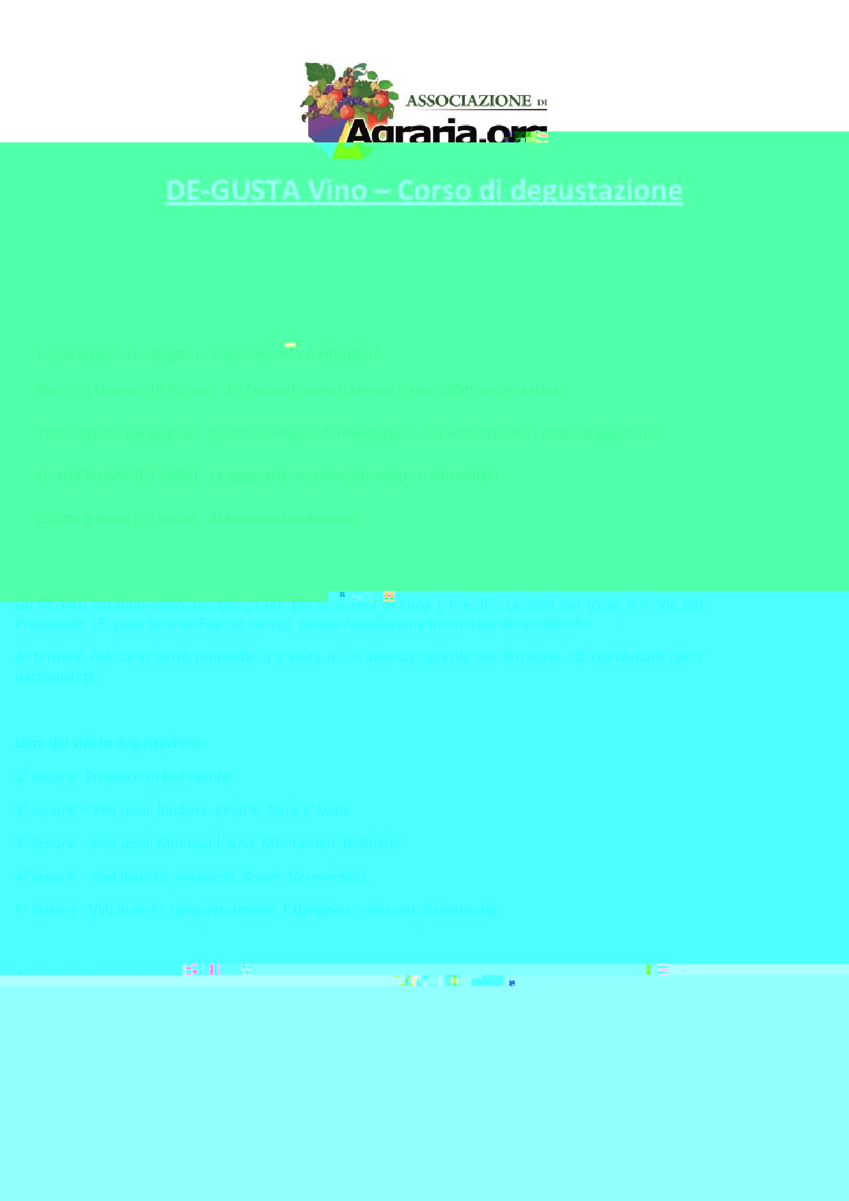 Gli incontri mirano a fornire un approccio consapevole al mondo del vino, partendo dalla vigna, passando per la cantina, fino ad arrivare alla nostra tavola! Al termine di ogni lezione verranno proposti diversi vini in degustazione guidata. Per info ed iscrizioni scrivere a: associazione@agraria.orgCiao, Luca