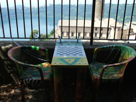 Le mie foto sono davvero solo ricordi del viaggio appena concluso e non possono competere per tecnica e bellezza con le vostre, ma mi piace rendervi partecipi di un piccolo diario di viaggio di questa settimana trascorsa in una zona splendida del Lazio, la zona dei Castelli romani. Inizio con una foto del Lago di Nemi ed una che mi piace molto perchè lungo un sentiero che si percorre dal centro di Nemi, qualcuno ha messo a disposizione una scacchiera su un tavolino e due seggiole, il tutto dipinto con tanti colori, invitando i viandanti a fermarsi per un po', fare una partita e riprendere la via... purtroppo io e mio marito non abbiamo trovato le pedine... c'e' sempre qualcuno che pensa di essere più furbo degli altri. Un vero peccato perchè invece il mio apprezzamento per l'ignoto personaggio che avuto questa meravigliosa idea è pari al mio disprezzo per chi ha portato via le pedine: molto, molto grande. Poi alcune foto ancora...