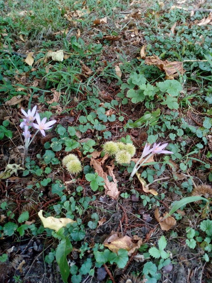 Ricci di castagne immature a terra, crocus (?) e castagno ripreso sfiorando la cima di un fico.