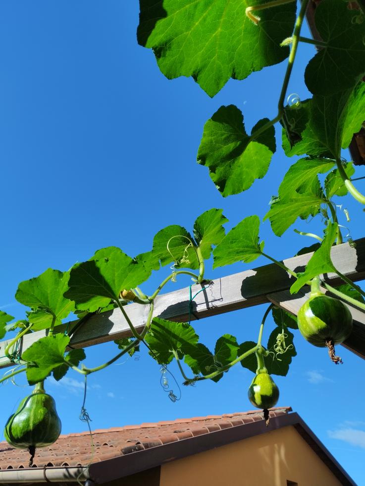 niente zucche. Buon fine settimana anche da parte mia, cominciato il freddo....! A proposito di zucche, come ho già detto, della vaschetta da due zucche acquistata (tipologia di Chioggia), una è seccata subito e l'altra con un avvio a zucche immediato, dopo ha continuato con le zucchette nche cadevano o marcivano. Ne è rimasta una che nonostante le cure ho dovuto raccogliere col peduncolo ancora verde, causa una macchia da inizio bolla nera. Grandezza minma da un paio di kg. Comunque ho realizzato, a seguito dell'andazzo di cui sopra, delle piantine con semi miei dell'anno precedente (con un pò di ritardo) delle 4/5 piantine ne ho messo 4 in giro per il terreno in punti in cui c'era possibilità di arrampicarsi da sole e una vicino ad un pergolato davanti a casa. Nonostante le cure ho dovuto irrigare e aiutare per l'arrampicata. Poi deluso perchè non si vedevano zucche ho lasciato andare. Deluso anche da quella vicino al pergolato che, seppure vigorosa, non si arrampicava su per i pali squadrati e sono dovuto ricorrere a legarla a mano. Non capisco perchè con i viticci tanto lunghi non si serrino su per il gazebo in legno. Dopo un pò appaiono le zucche, ce ne sono tante. Penso che il problema che abbiamo avuto tutti consistesse nel troppo caldo. Allego una foto di alcuni giorni fà ma adesso sono più grosse e domani, se vado sù, farò nuove foto. Temo purtroppo che col "fresco" che si potrebbe instaurare, non riuscirà ad esserci un buon esito finale....!! PS. scusate se non riesco ad essere sintetico, riconosco che è un mio difetto....