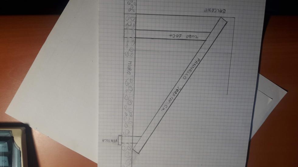 Sarà messo obbligo rispetto al muro e farò un buco di 10 Cm in basso, collegarlo con un tubo flessibile di diametro 10 Cm, (lunghezza 80 Cm), per asportare aria dalla camera e farla passare all'interno del pannello che la riscalda, poi faccio un buco da 10 Cm in alto, una volta riscaldata la rimetto dentro la camera attraverso un tubo di 10 Cm. ( lunghezza 30 Cm).