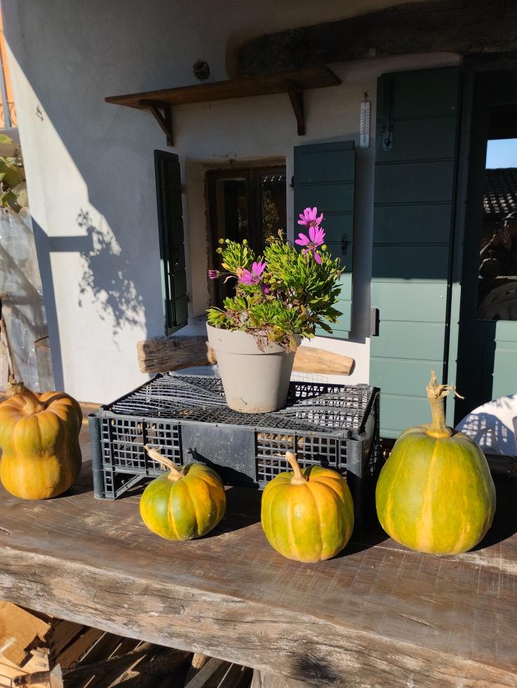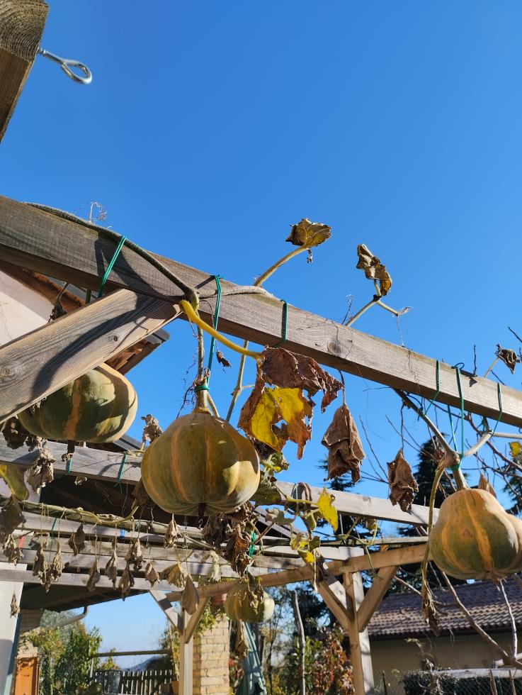 Sono stato, dopo 10 giorni, martedì nell'orto. Dopo il vento e la pioggia ho visto che tutto ha tenuto, anche le serrette, e non sono caduti alberi. Ho raccolto alcune zucche sparse e controllato alcune appese. Di entrambi i tipi unisco le foto. Le prime avevano il gambo esile e rinsecchito, le seconde sono ben messe e si potrebbe aspettare per la colorazione. Però arriva il gelo ed è meglio toglierle. Tutto impiantato in ritardo. Fatto una nuova esperienza. Buona giornata e buon pranzo. Un caffè ai passanti.