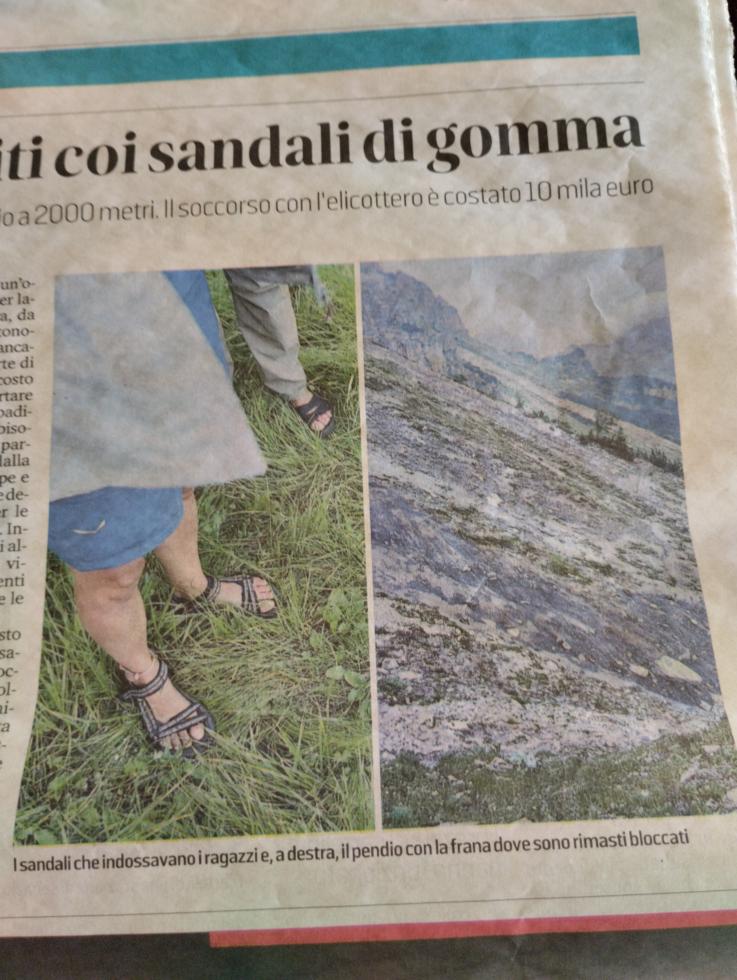 Salvati gli escursionisti coi sandali. Quattro giovani, due ragazzi e due ragazze tra i venti e i trent'anni, sono saliti oltre i 2000 metri su sentiero impervio, coi sandali in gomma. Alla sera hanno chiamato i soccorsi. Ma come si fa.....!!