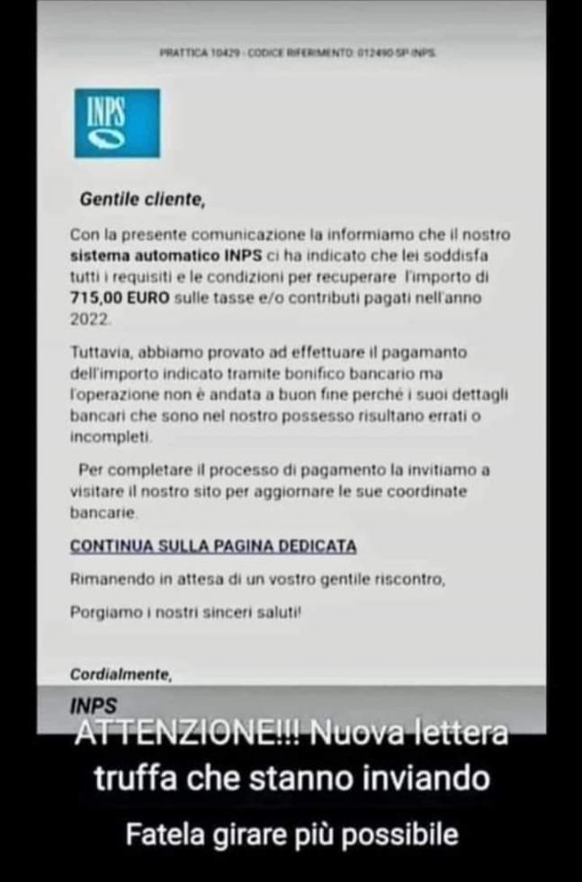 È da un po' che gira questa truffa. L' Inps invia comunicazioni con scritto nome e cognome oltre alle coordinate bancarie ogni volta che accreditano la pensione o addebito/crediti. Sempre peggio .