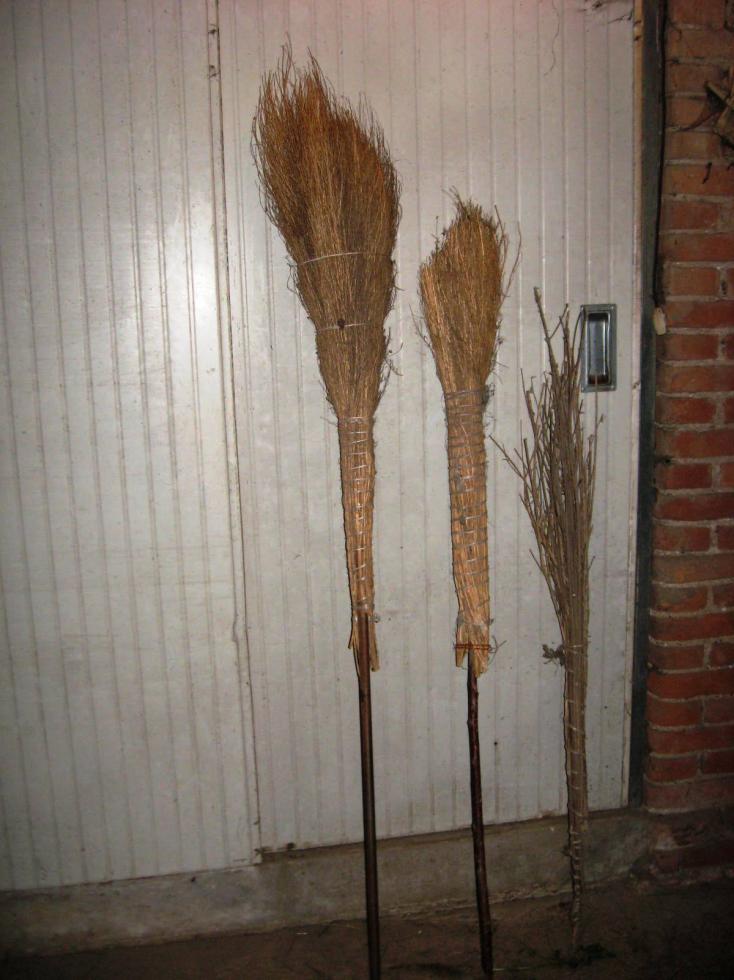 l'esemplare nella foto sopra - ricavata da internet - è ancora giovane e non completamente sviluppato, amaturità diventerà rosso. Queste sotto sono alcune mie scope in diverse condizioni di usura. Puoi anche vedere che una è stata costruita senza l'ausilio di un manico accessorio, sfruttando, allo scopo, i fusti legnosi principali.