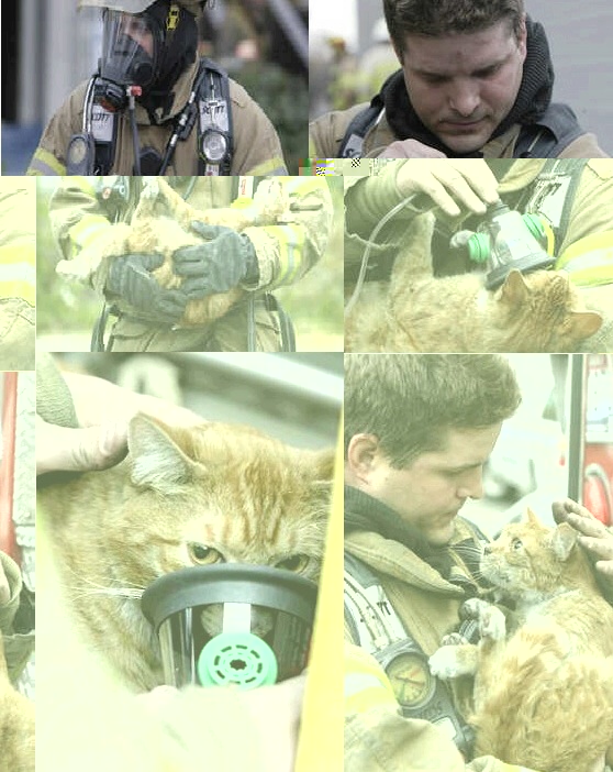 è un pompiere che ha dato l'ossigeno al micio che ha respirato fumo. bello, ma è il suo lavoro!