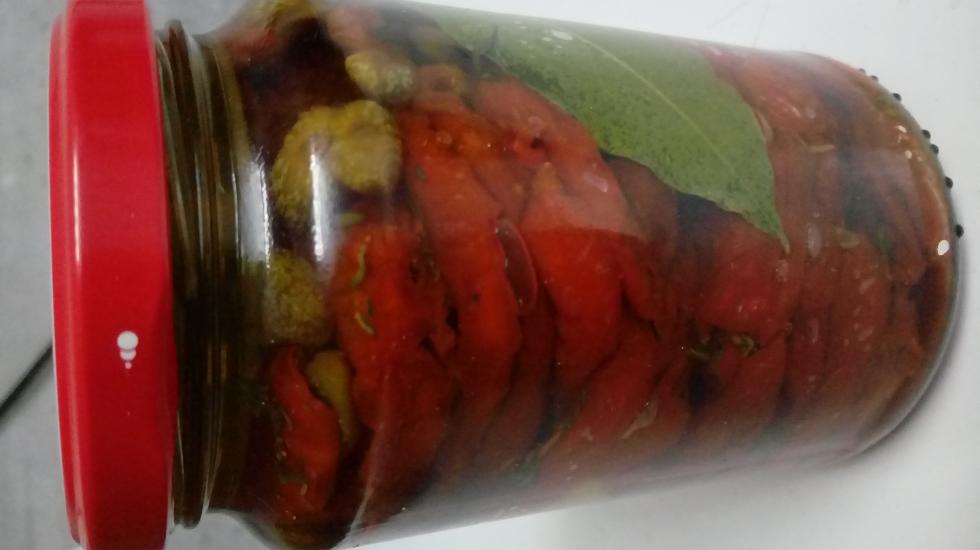 Pomodori seccati al sole e messi sott'olio con erbe aromatiche.