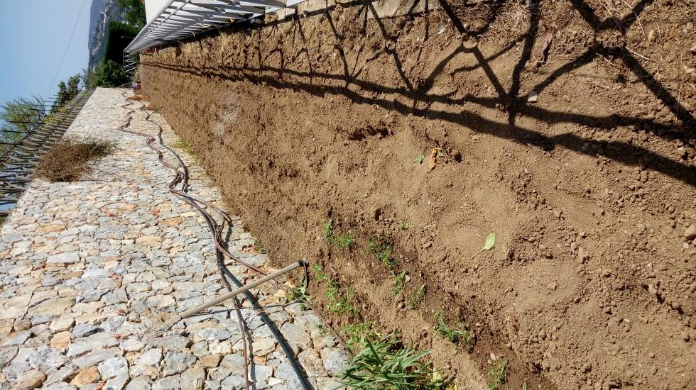 Striscia di orto motozzappata. Ora si pianta e innaffia con l'acqua piovana della piscina tirandola con una pompa nell'orto.