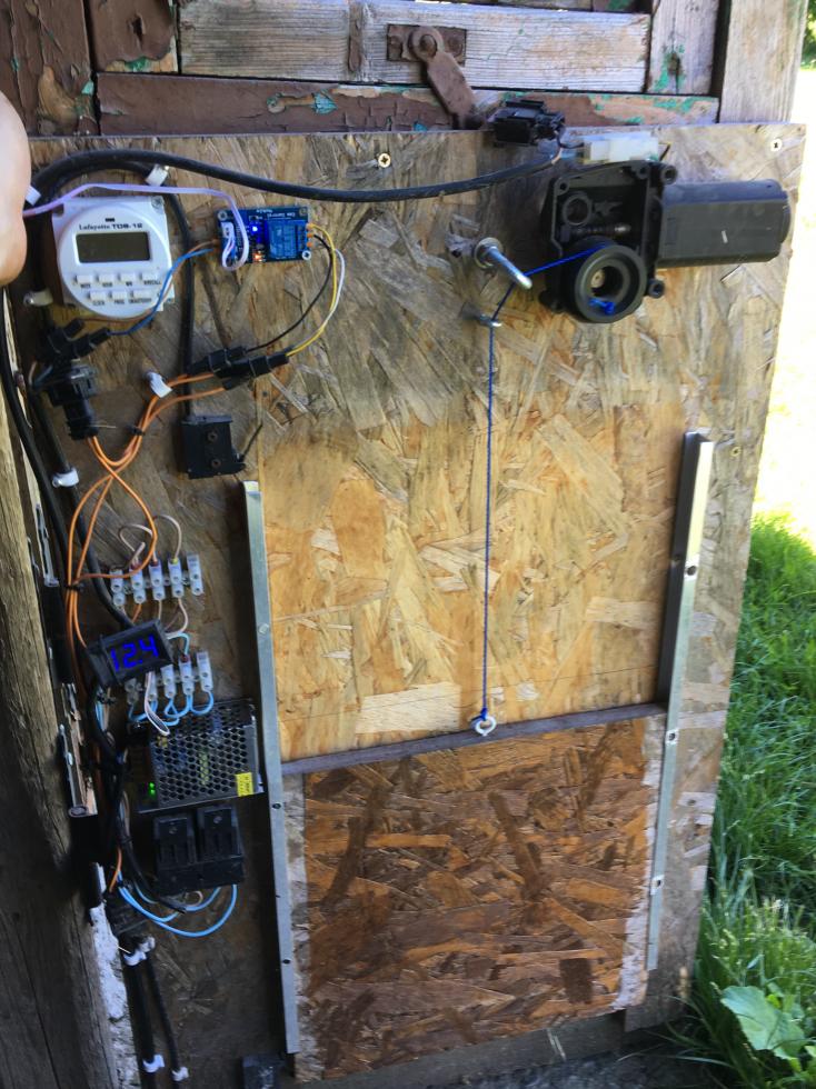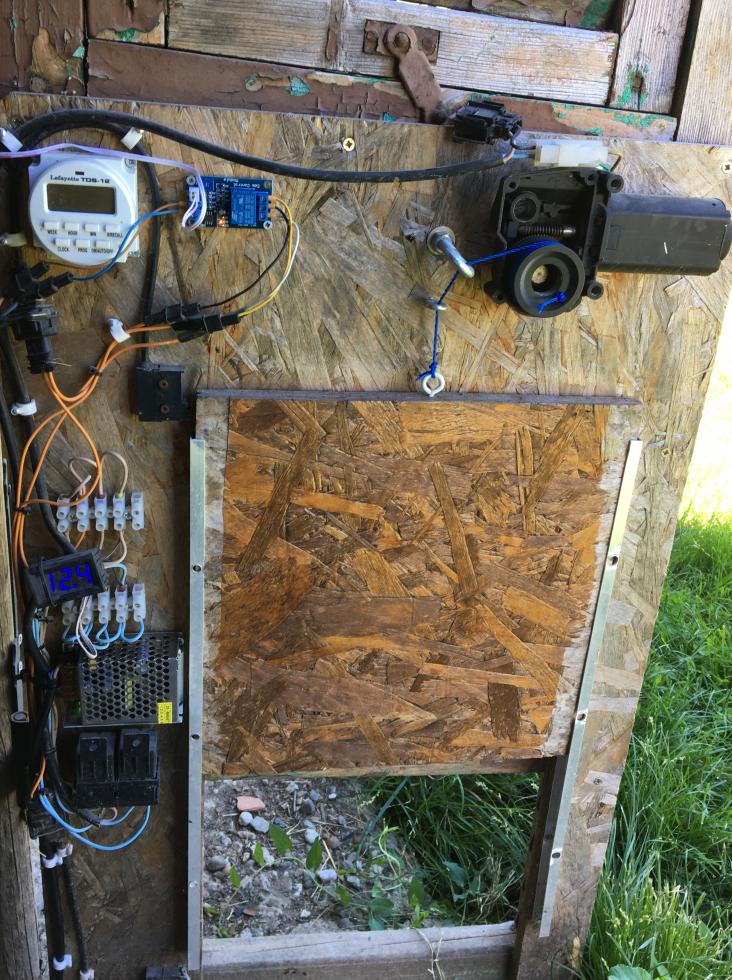 Qualche anno fa feci una porta automatica per le galline. Funziona ancora adesso. Inizialmente aveva un timer per l’apertura/chiusura. Poi l’ho sostituito con un sensore crepuscolare. È molto grezzo ma funzionale. Trovai lo schema elettrico in rete. Il tutto alimentato a 12v.